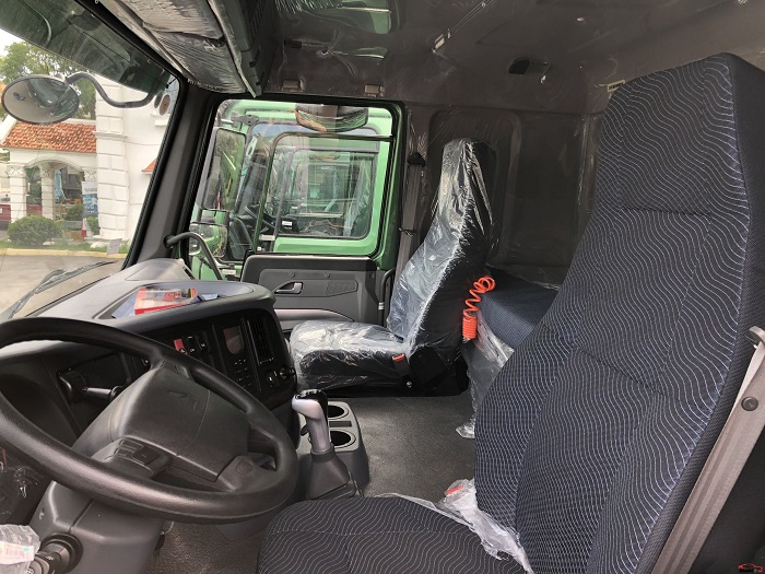 Nội thất rộng rãi với tông màu nội thất ghi xám sang trọng và hiện đại. Tầm nhìn quan sát rộng, thoải mái cho người lái. Bảng điều khiển trung tâm: Có trang bị đầy đủ chức năng như phanh cup pô, ga tự động Cruise control, cài cầu, cái cứng và công tắc cài ben cũng như các chức năng thông thường khác trên xe ben, thiết thực, đáng tin cậy, đơn giản, thanh lịch và hào phóng.